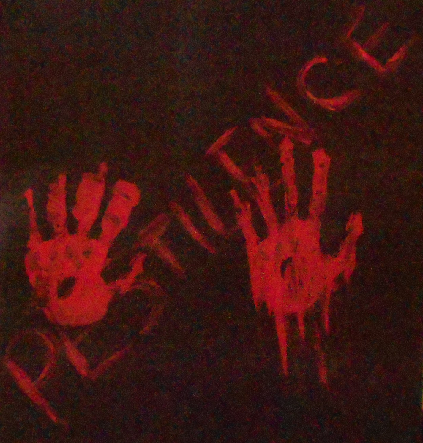 For our first design we thought of having the word 'Pestilence' on a black piece of paper in the colour of blood. Using the red writing would connote to blood as the girl has been killed. We brainstormed in what other signs/symbols would make it look more realistic and came up with having a hand print smudged, which would look like blood from the victims hand. And as she is dying the audience knows and begins to feel her pain.